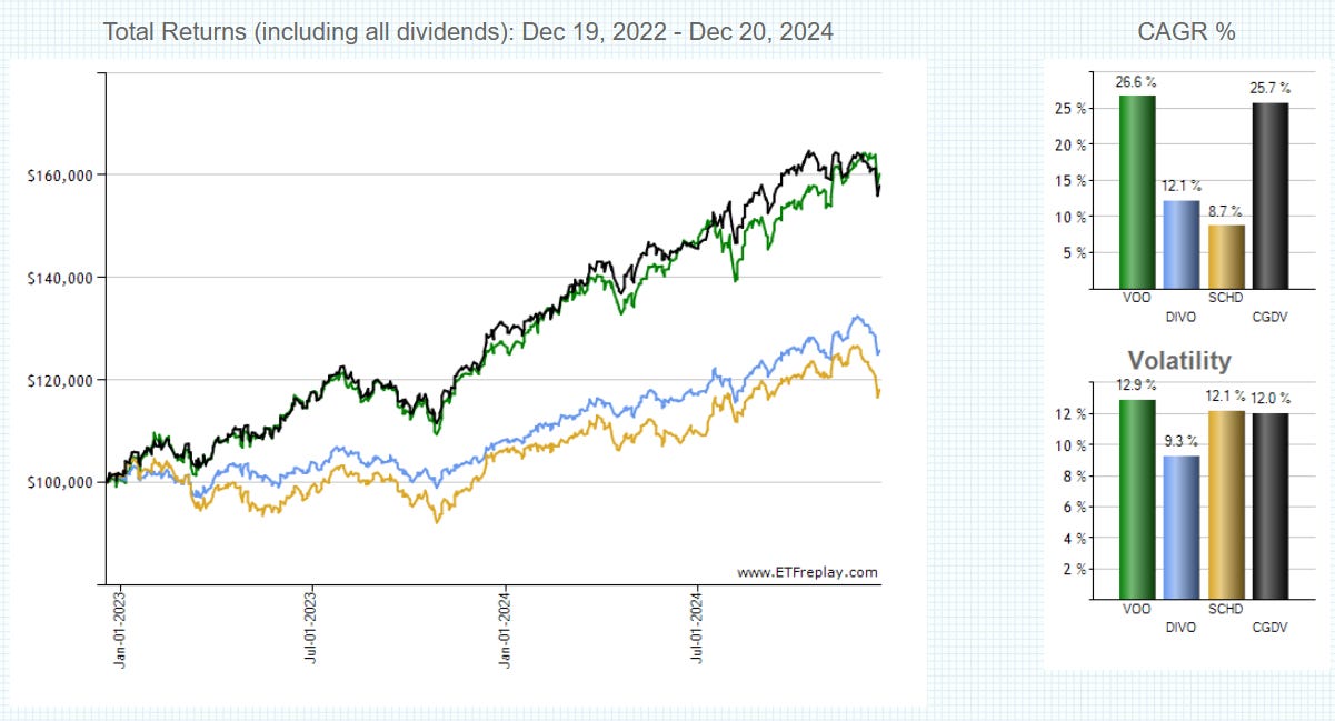 DIVO actually beat the popular SCHD over the last 1-3 years and is a good consideration for more conservative exposure. CGDV and CGDG do not use options to boost income. I would recommend these to retain your equity upside.