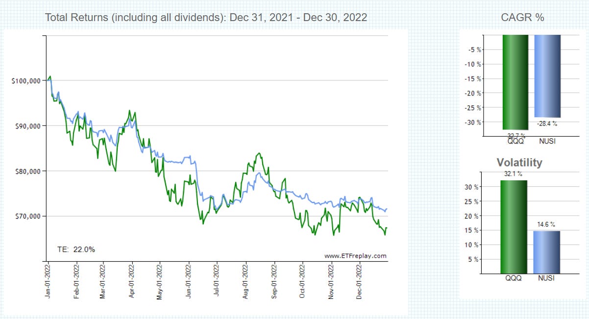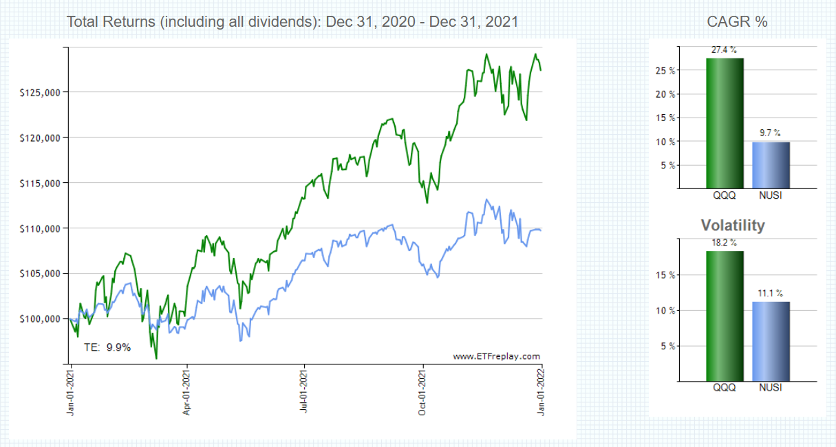 Look at what NUSI has done during 2021 and 2022, separately, one bullish and one bearish year, versus QQQ. It severely underperformed (-17%) in 2021 and very modestly outperformed (+5%) in 2022.