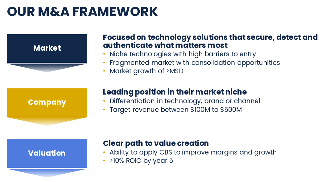 Let’s introduce CXT’s acquisition strategy with its own M&A Framework to start us off. Management is focused on the authentication technologies market which is growing at mid-single-digits (MSD) or higher. The team targets a 10%+ ROIC by year five but accretive EPS within year one.