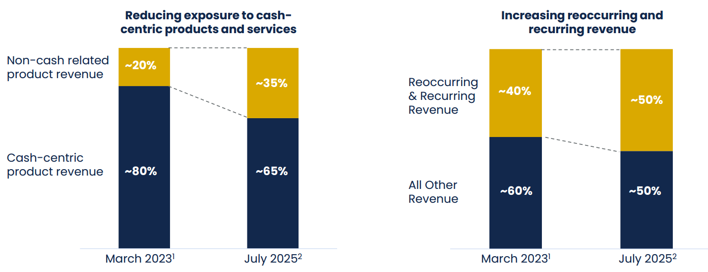 One underappreciated aspect of CXT’s robust M&A pipeline is its impact on Crane NXT’s business mix. The company has actively been reducing its reliance on physical cash-related products and increasing its share of recurring revenues. Upon closing of the De La Rue deal next quarter, management expects: