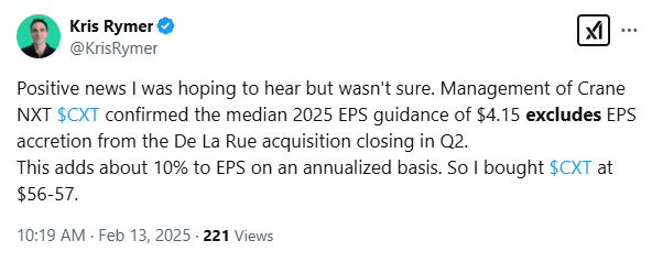 This means that unless analysts revise their estimates, the market may be underpricing CXT’s forward earnings potential. Management is perhaps just being conservative given the uncertainty around tariffs, which we can discuss later. Here is the tweet I posted while listening to the CXT earnings call last Thursday.