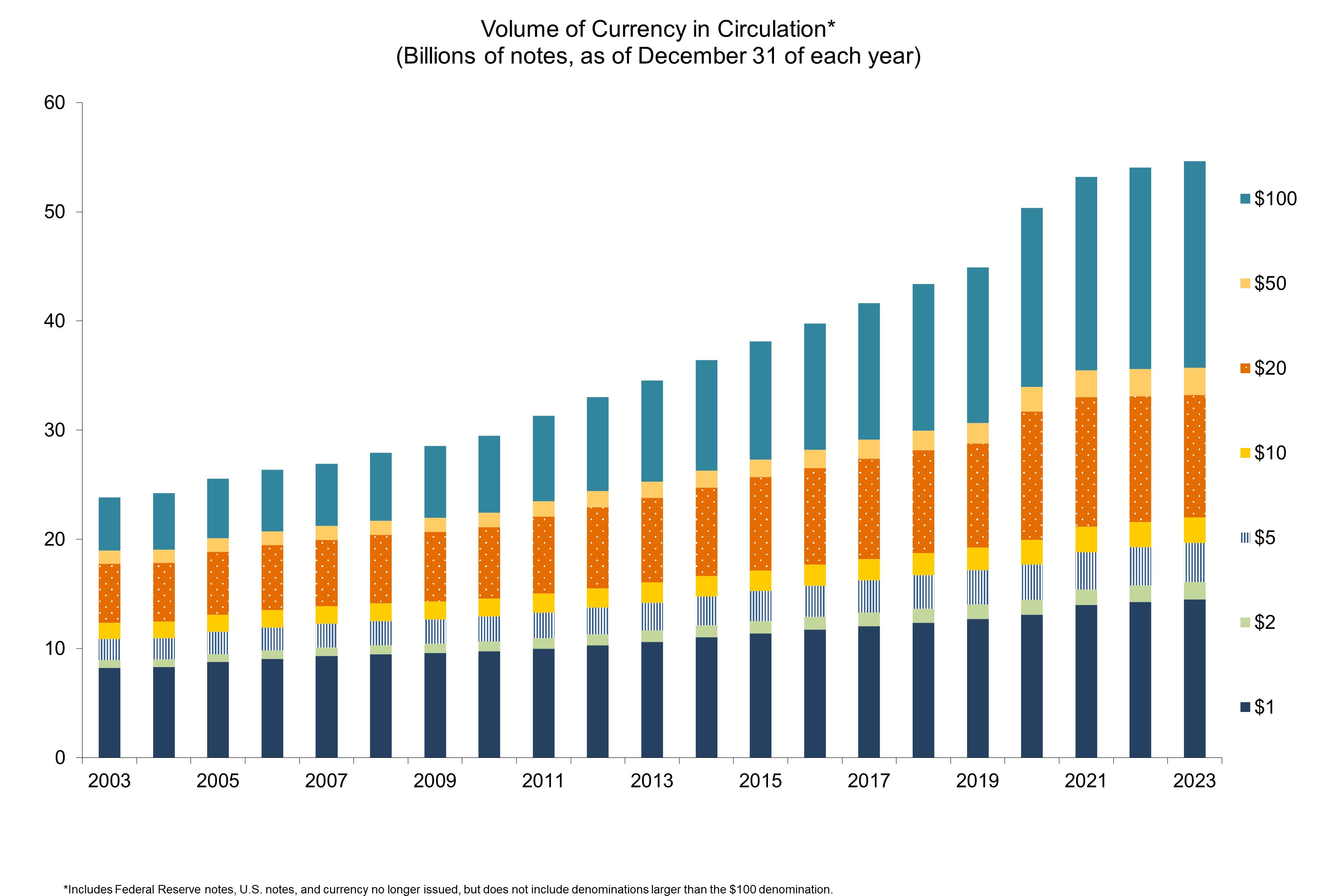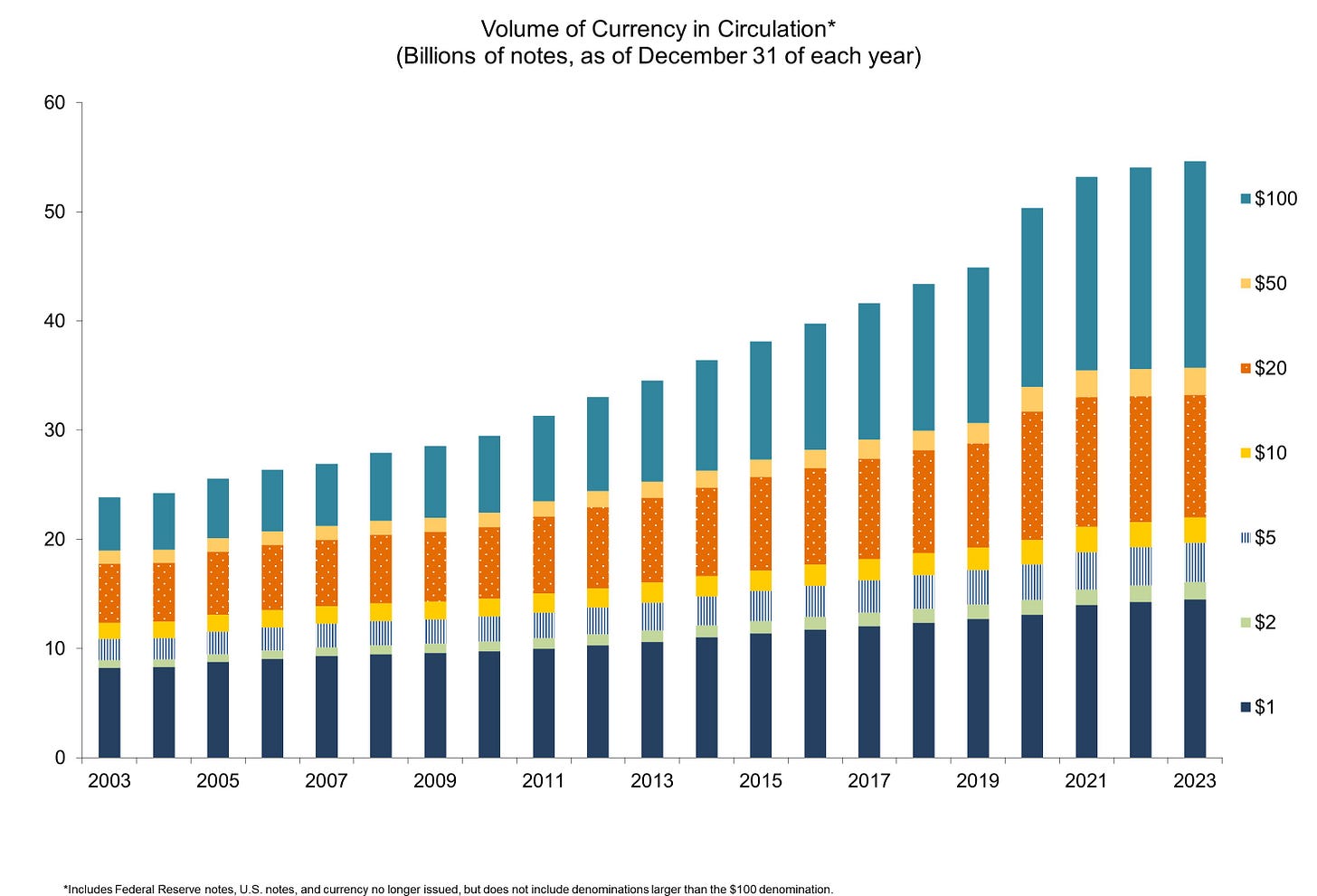 The Federal Reserve expects a 3% CAGR of banknotes in circulation through 2030, driven by inflation and demand for physical cash due to natural disasters or global uncertainty. Below this chart from the Federal Reserve shows the trend of currency in circulation over the last 20 years.