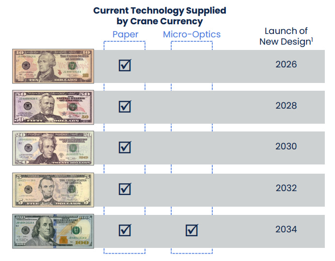 ❌ U.S. currency business remains cyclical — growth depends on future redesign cycles. CXT is diversifying its business, and these design cycles are long and planned years in advance. The graphic below shows the upcoming new designs and series printing reported by the Bureau of Engraving and Printing (BEP).